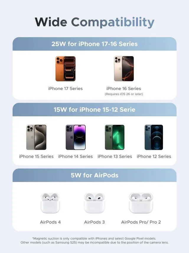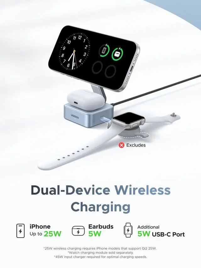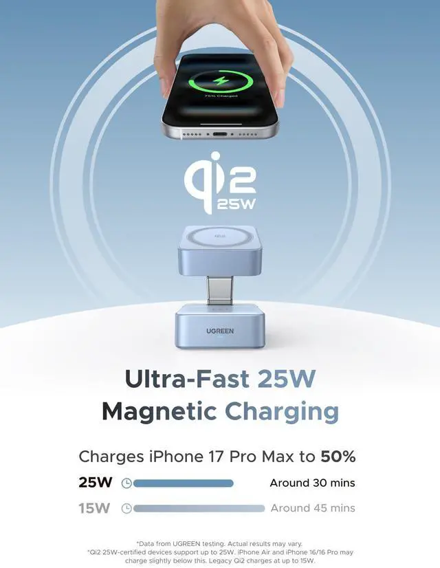Power up all your essentials with the UGREEN 25W 2-in-1 Magnetic Wireless Charger. Certified with Qi2, it delivers blazing-fast 25W wireless charging for iPhone 17/16/15/14/13/12 series, while also charging your AirPods at the same timejust place them on the pad, no cables needed. An additional 5W USB-C port is designed for your Apple Watch or other small devices, so you can charge three gadgets together with one sleek stand. The foldable, ultra-compact design fits easily into your bag, making it perfect for home, office, or travel. With 16 strong magnets for secure alignment and ThermalGuard smart temperature control, you get safe, efficient charging anytime, anywhere.