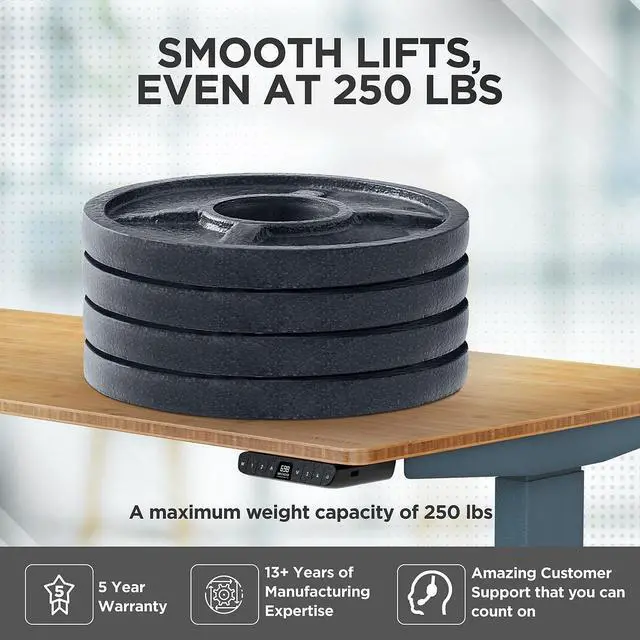 • DESIGNED TO OUTPERFORM: The electric desk frame has 2 motorized desk legs that effortlessly raise and lower your work surface. Fast, smooth, and quiet motors on the standing desk legs effortlessly lift up to 250 lbs.