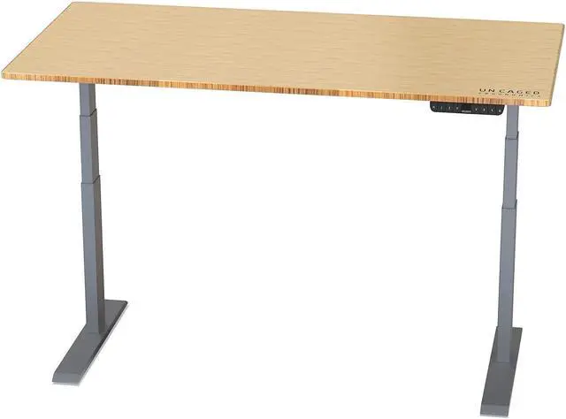 Two premium motors, one in each leg, safely and smoothly lift loads up to 250lbs. Each leg has 3-stage lifting columns for more height range and better lifting capacity. Anti-collision technology is built into to the control box to help prevent lowering the desk on top of an object. The elegant control panel features an LCD screen with the numerical height reading, auto up/down buttons, and 4 programmable memory settings, letting you adjust desk height to your favorite settings with one press. The included desktop measures 60x30x1 and is made our of premium, eco-friendly solid bamboo. Uncaged Ergonomics has manufactured Rise Up since 2010. - 3-stage lifting columns for more height range and a heavier lifting capacity- DUAL MOTORS for a fast, smooth, even adjustment- ADJUSTABLE WIDTH FRAME fits many spaces and a range of desktop sizes- ANTI-COLLISION to help prevent accidentally lowering the desk too far.- Frame Width: Adjustable 42.3-71- Adjustable Height Range: 23.6-49.2 - Frame Depth (front-to-back): 25.6 - Lifting Capacity: 250 lbs- Frame Material: Steel- Frame Features: 2 Motors / 3-Stange Lifting Columns / Anti-Collision- Control Panel: Auto Up/Down + 4 Memory Presets- Desktop Size: 60x30 - Desktop Material: Solid bamboo.