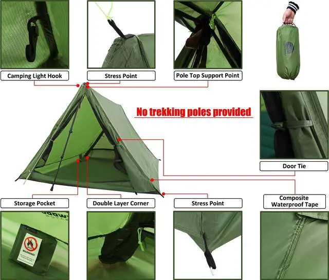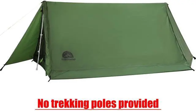 • TREKKING POLE TENT: Why Underwood Aggregator trekking pole tent? This two people backpacking tent could be set up with trekking poles or any stick longer than 46 inches. However, this lightweight 2 person tent also works fine between two trees without the poles or sticks. This backpacking 2 person tent is easily pitched by 1-2 people without any experience in 2 minutes(NO TREKKING POLES PROVIDED!!!)