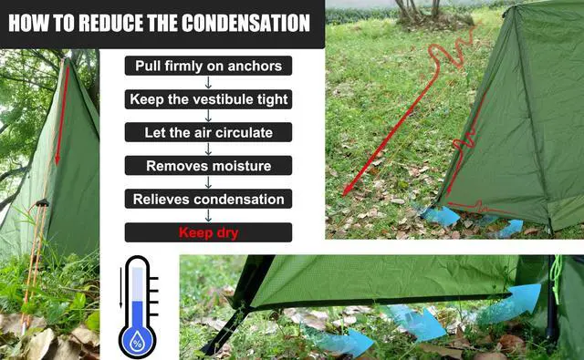 The most important factor to reduce condensation is ensuring ventilation. Stake down the vestibule with tent stakes and keep it tight let it far away from the mesh, and make sure the gap between the ground and the vestibule is enough for airflow.