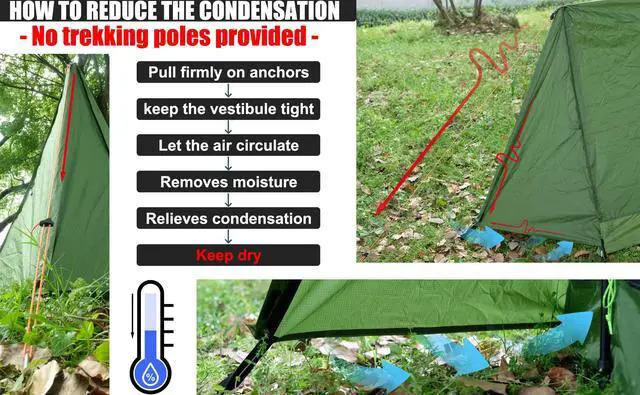 The most important factor to reduce condensation is ensuring ventilation. Stake down the vestibule with tent stakes and keep it tight let it far away from the mesh, and make sure the gap between the ground and the vestibule is enough for airflow.