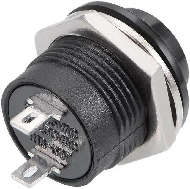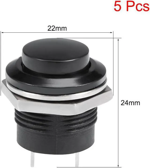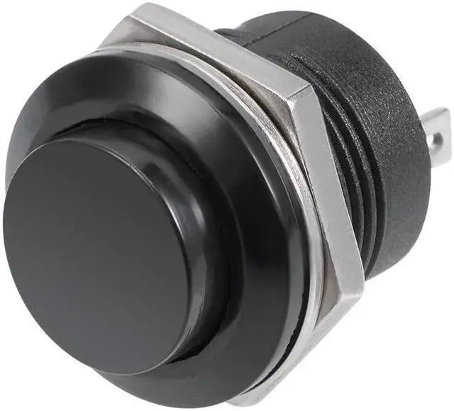 1NO 1NC (SPST) contact type, black round head, momentary action, 16mm panel cutout diameter.