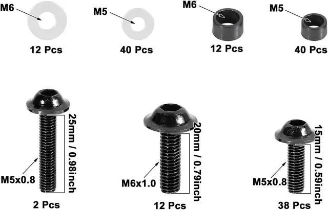 Size Chart :Type---Quantity--Thread Size----Stem LengthType1---38pcs--M5x0.8---- 15mm/0.59inchType2---12pcs--M6x1.0---- 20mm/0.79inchType3---2pcs--M5x0.8---- 25mm/0.98inchType---Quantity--DiameterType4---40pcs----M5Type5---12pcs----M6Type6---40pcs----M5Type7---12pcs----M6Type8---2pcs----M5/M6