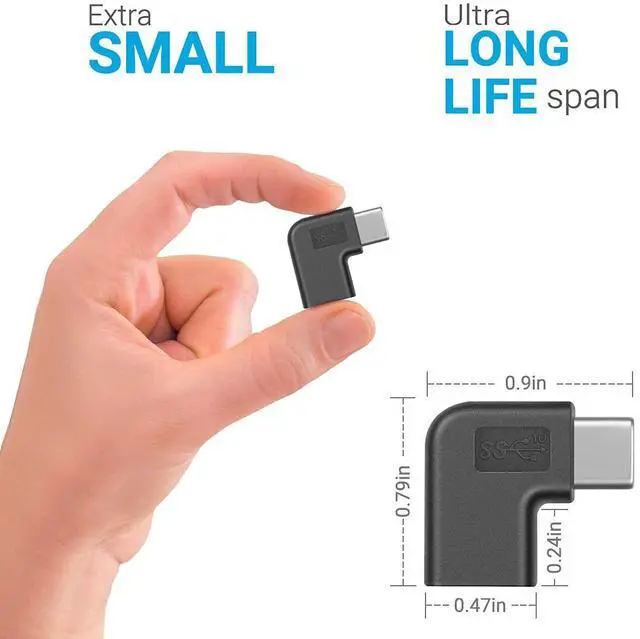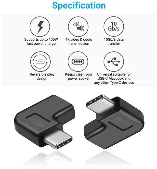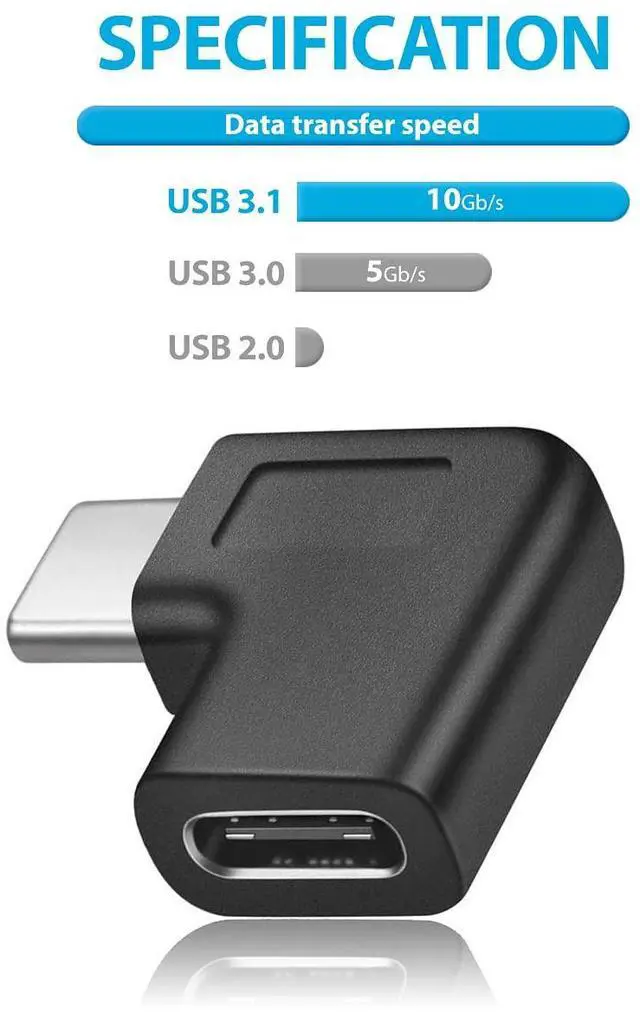 Type C USB 3.1 Right Angle adapter supports USB 3.1 with high speed data sync and 100W power charging. This adapter is compact, light-weight and portable.