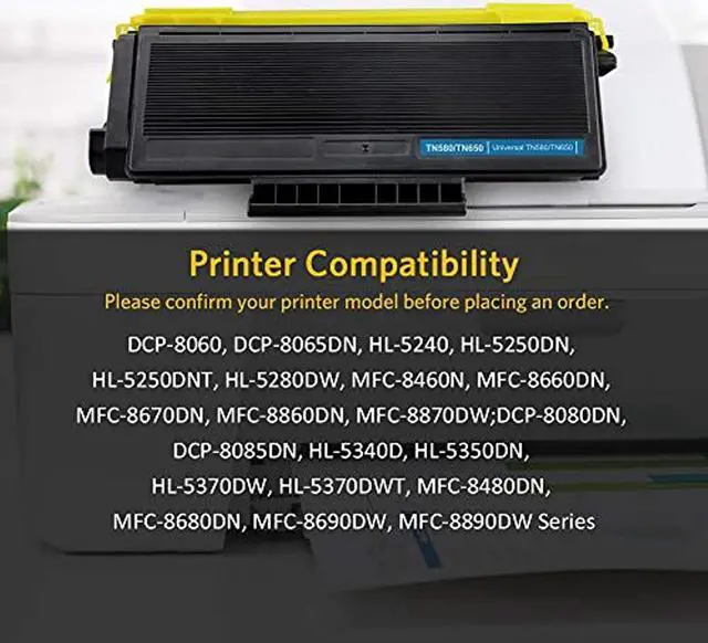 HP Printers: Brother HL-5370DW 5340D 5250DN 5240 5280DW MFC-8480DN 8460N 8660DN 8670dn 8680 8690DW 8890dw 8870dw 8860dn DCP-8080dn 8060 8085dn 8080DN printer series ^^ Every toner cartridge from us is under thoroughly tested and more than standard. Ensuring your reliable printing results in sharp text, bold blacks and crisp graphics ^^ Highest standards of quality, reliability and compatibility. No harm to your printer. V4INK TN650 TN580 toner cartridge will be a perfect partner with your printer ^^