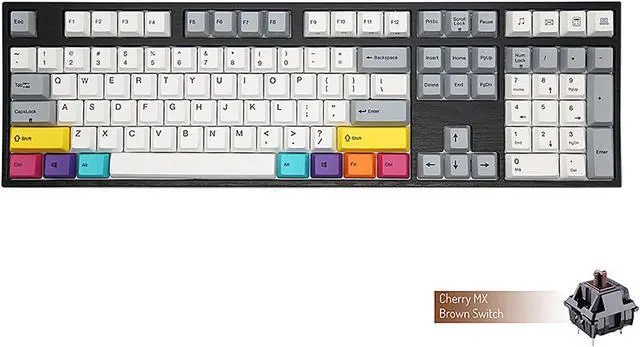 | Features | Full sized layout including number pad Genuine Cherry MX Brown Switches - provide users with a distinguishable tactile bump to let you know exactly when your keystroke has been activated Premium PBT keycaps using Dye Sublimation, a technique used to melt font and design into the plastic Fixed White LED backlighting Follows the standard QWERTY ANSI layout Features full USB N-Key Rollover Multimedia shortcut keys Cable routing grooves and two stage rubber feet Mini USB interface with 60 inch theme matching cable |