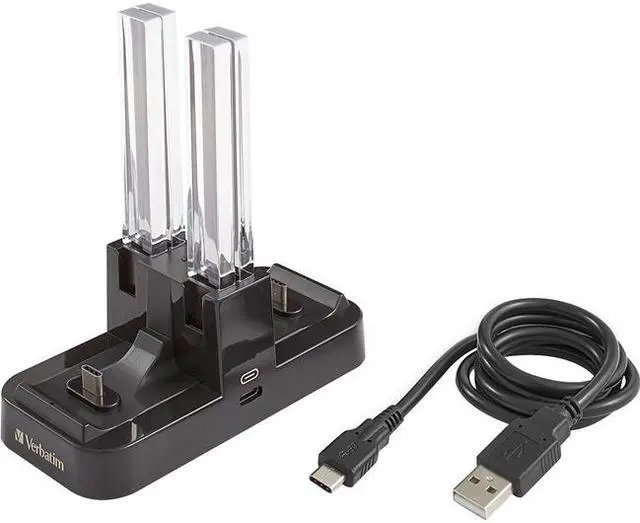 Charge your controllers your way with the Verbatim Multi Controller Charging Stand. Designed for use with Nintendo Switch Joy-Con controllers and Nintendo Switch Pro controllers, this charging stand lets you mix and match for the ultimate in charging function. This stand is capable of charging up to 4 Joy-Con controllers or 2 Pro controllers simultaneously with an LED indicator showing the charge level. With a compact, portable design, this stand is ideal for on-the-go use. This charging stand is compatible with the Nintendo Switch power adapter. The Verbatim Multi Controller Charging Stand for use with Nintendo Switch Controllers is backed by a 1-Year Limited Warranty.Connectivity Technology: DockingCharging Capability: YesDevice Supported: Gaming ControllerHost Interface: ProprietaryPackage Contents: Multi Controller Charging Stand for use with Nintendo Switch Controllers 1 x USB-C Cable Compatibility: Nintendo Switch Controllers Pro Controllers Joy-Con Controllers Limited Warranty: 1 YearPackage Contents Multi Controller Charging Stand for use with Nintendo Switch Controllers 1 x USB-C Cable