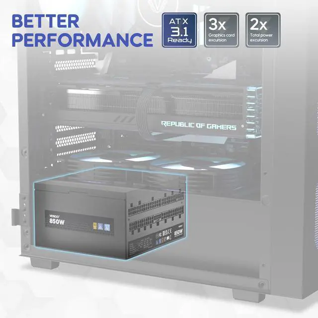 With dual PCIe 5.1 connectors, Vetroo 850W power supply can handle even the most demanding graphics cards with ease. The ATX 3.1 standard ensures compatibility with a wide range of systems. Plus, with 80 Plus Gold certification, you can expect high efficiency and low operating costs.