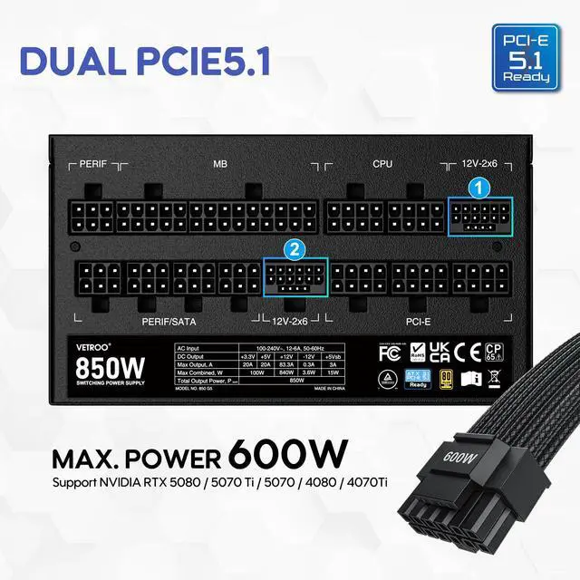 Vetroo 850W Power Supply Dual PCIe 5.1 ATX 3.1 Ready, 80 Plus Gold Full Modular, Quiet Operation with 120mm FDB Fan, 10-Year Warranty - Black