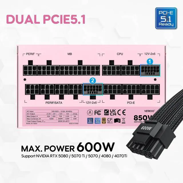 With dual PCIe 5.1 connectors, Vetroo 850W power supply can handle even the most demanding graphics cards with ease. The ATX 3.1 standard ensures compatibility with a wide range of systems. Plus, with 80 Plus Gold certification, you can expect high efficiency and low operating costs.