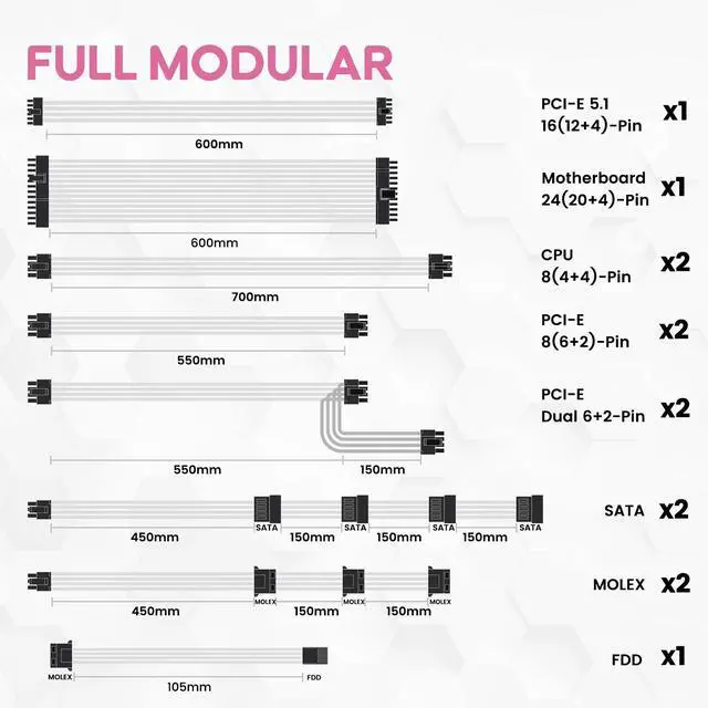 Our power supply is built to last, featuring Japanese 105° C capacitors for superior performance and longevity. The full modular design provides easy cable management, allowing you to customize your build and improve airflow. The Fluid Dynamic Bearing fan ensures quiet operation, so you can work or game without distractions.