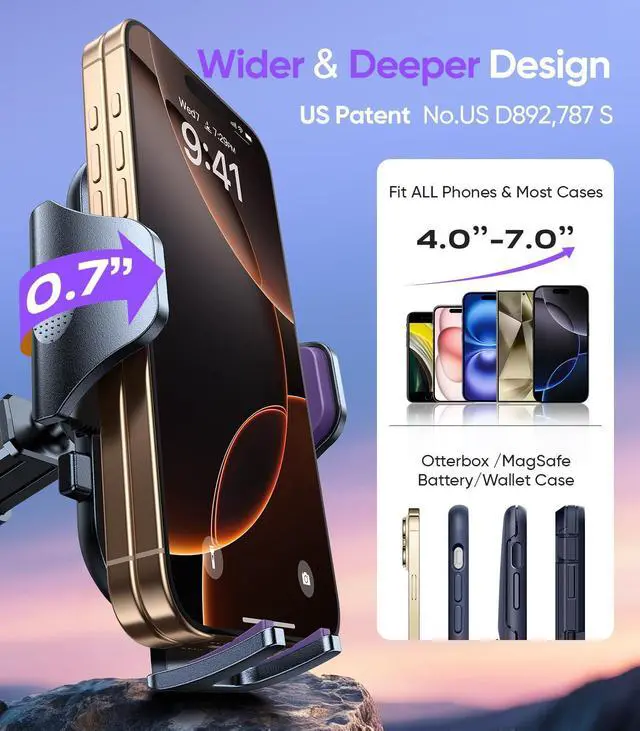 [Universal Fit Holds Big Phones & Thick Cases] The extra-wide arms and adjustable foot make this car phone holder mount perfect for all smartphones (4-7), including iPhone 16 Pro Max, Samsung S24 Ultra, and phones with thick OtterBox cases. No blocking ports, no slippingjust a perfect fit every time.
