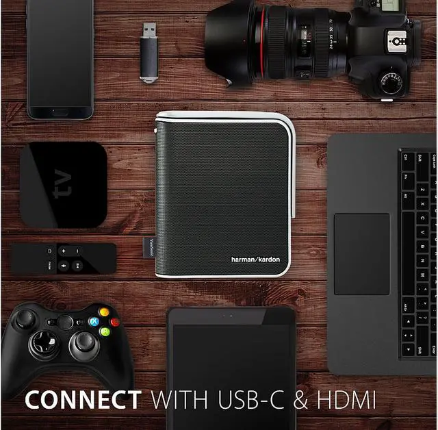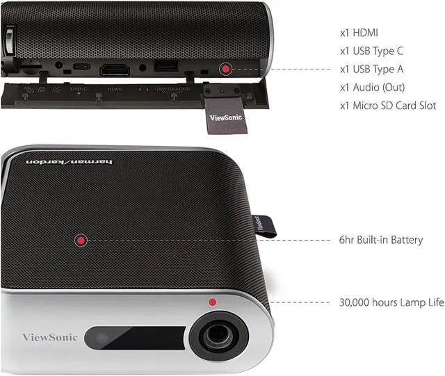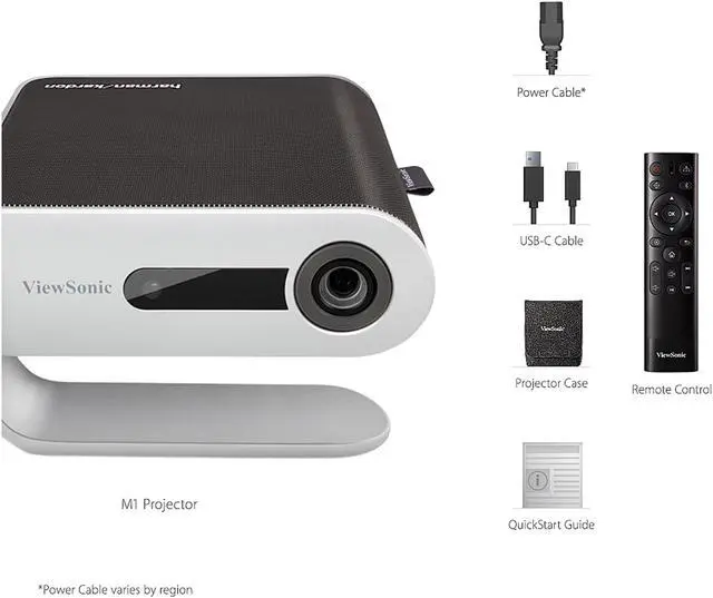 A built-in safety feature temporarily turns off the lens when objects are detected too close to the projector. Dual Harman Kardon speakers provide crisp and clear sound for multimedia content, while a short throw lens can display large images in small spaces. Whats more, versatile connectivity options include a MicroSD card slot, USB Type-A, and USB Type-C making the M1 a great option for sharing and displaying videos and other multimedia content...