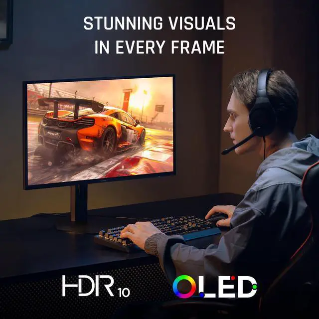 Designed for long sessions, the fully adjustable ergonomic stand lets you dial in the perfect viewing position. With HDMI 2.1 and DisplayPort connectivity, this 27" monitor is ready for high performance PCs, consoles, and everything in between. Stunning Quantum Dot-OLED Visual PerformanceThis monitor utilizes Quantum Dot OLED (QD-OLED) technology to create stunning visuals. Instead of relying on white backlights or filters, it employs a self-luminous blue OLED light source that excites a layer of quantum dots to generate precise colors. This architecture maximizes light efficiency, delivering significantly higher brightness and color volume than standard OLEDs, while retaining the infinite contrast and instantaneous response times essential for high-performance gaming.