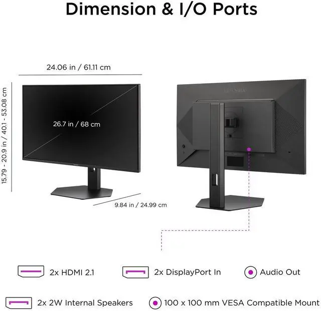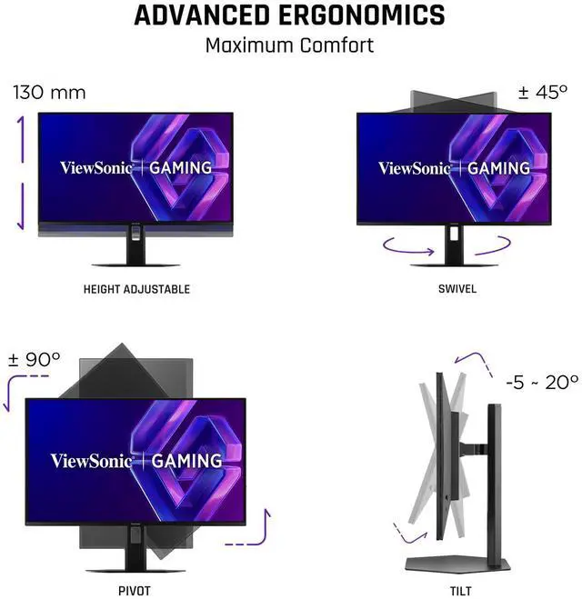 This eliminates screen tearing and minimizes stutter and input lag for the most breathtaking gameplay experience. Advanced Burn In PreventionOLED technology delivers stunning visuals, but static images can sometimes cause burn in over time. ViewSonic's burn-in prevention technology helps protect your screen during everyday use. Advanced PXL Orbit technology discreetly moves pixels around while notification prompts encourage users to take periodic breaks. Static Screen Detection automatically dims the display when idle, providing users with an immaculate OLED viewing experience. Ergonomically Designed For GamersThis monitor features a fully adjustable ergonomic stand capable of considerable swivel, pivot, tilt, and height adjustment.