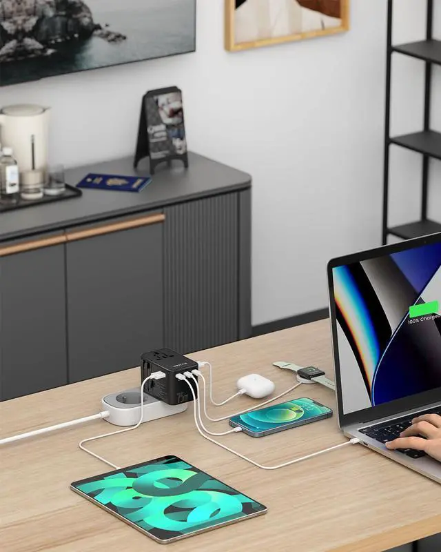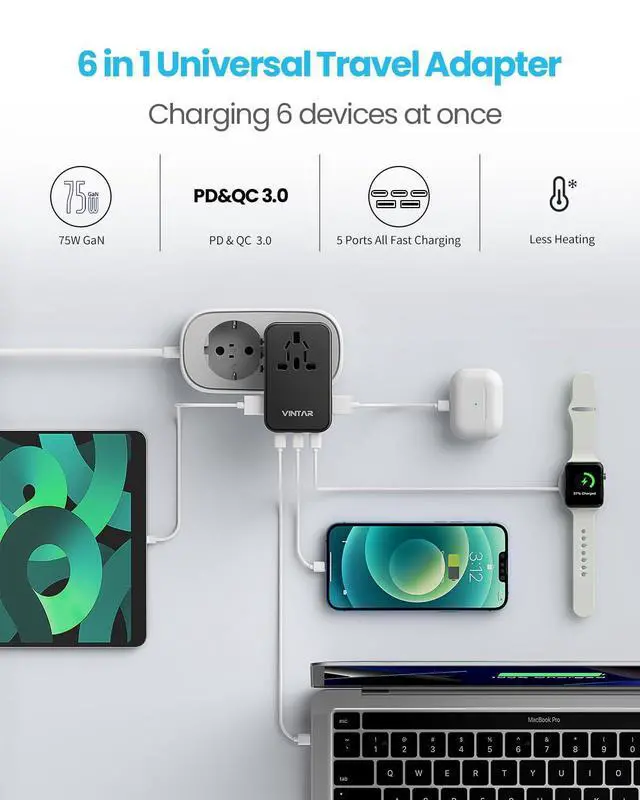 The USB ports on the adapter intelligently charge All Types of cellphones, smartwatches, headphones and tablets, and support PD and QC fast charging up to 75W. No need to bring the Original Charger.