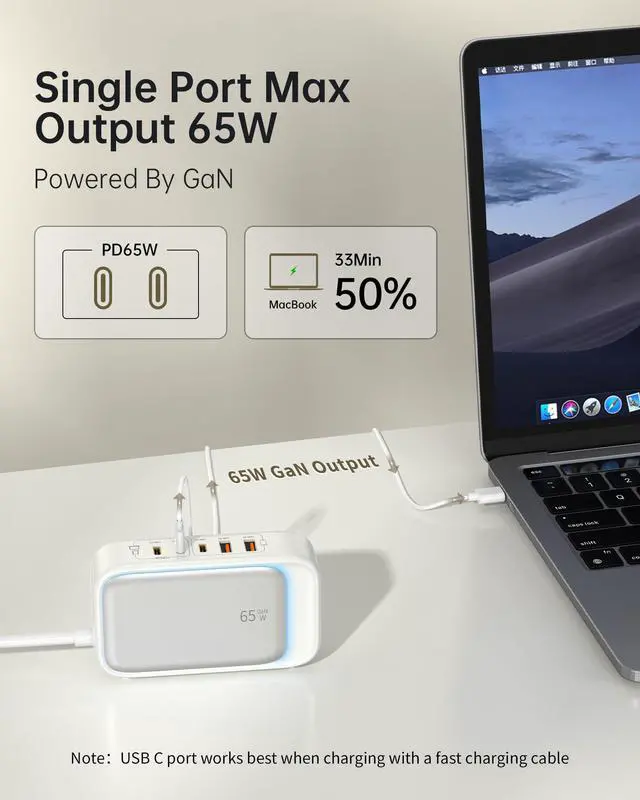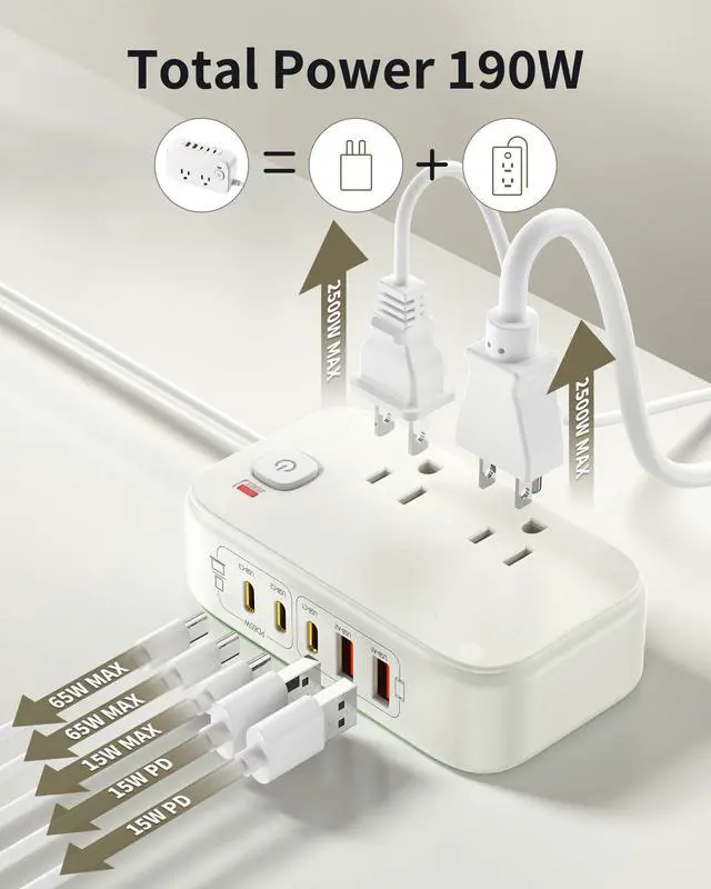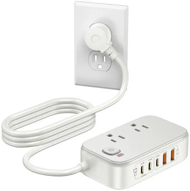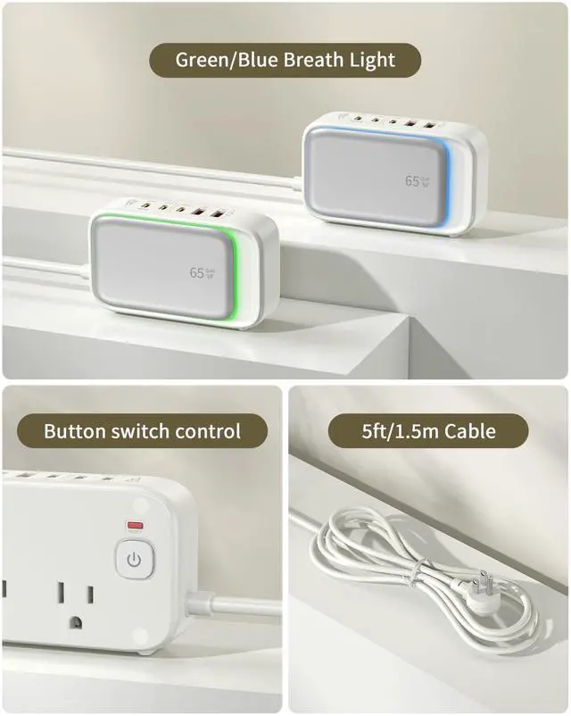 Efficient and fast charging: The charger is equipped with 2 power strips, 3 USB C ports and 2 USB ports, which can meet the charging needs of multiple devices at the same time. Whether you are using a mobile phone, tablet or other USB device, you can find a suitable charging interface and say goodbye to the trouble of frequently changing charging cables. Intelligent control: The charger has a unique button switch that can easily control the on and off of the power strip. When you don't need to use the power strip, just press it to turn off the power, which is energy-saving, environmentally friendly and safe. Breathing light prompt: After the power is turned on, the breathing light of the charger will show a soft green, adding a touch of warmth to your charging environment. When your device is connected to the C2 or C3 port for fast charging, the breathing light will automatically turn blue to remind you that the current device is enjoying fast charging service. This intuitive visual prompt allows you to keep track of the charging status at any time. Square white appearance: The charger adopts a simple and stylish square design, and the white appearance is elegant and generous, suitable for various home and office environments. No matter where you put it, it can easily integrate into your living space and create a neat desktop environment. Safe and reliable: We focus on the quality and safety performance of our products. The charger has multiple built-in safety protection mechanisms, such as over-current protection, over-voltage protection, over-heat protection, etc., to ensure a stable and safe charging process, protecting your device from damage and making your use more assured