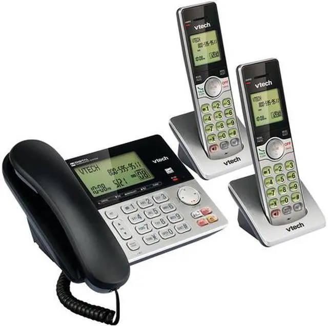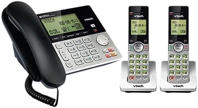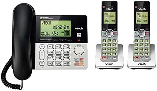 | Features | Expandable phone system with 1 corded and 2 cordless handsets is ideal for any home or office space DECT 6.0 digital transmission technology delivers excellent sound quality, security, and range Interference-free system does not get affected by wireless networks or other electronic devices, giving you crystal-clear conversations Digital security feature offers protection from identity theft by digitizing and encrypting your calls, virtually eliminating the possibility of somebody eavesdropping Integrated speakerphone feature on each handset lets you enjoy hands-free conversations, so you can do multitasking around the house Includes a digital answering system with up to 23 minutes of recording time; messages can be retrieved from either the corded phone or the handset 50 name and number phonebook directory allows you to easily store and access your frequent contacts Features caller ID/call waiting (stores 30 calls), call block, any key answer, handset volume control, last number redial, page/handset locator, and a selection of ringtones Quiet mode allows you to silence the handset ringer and base instantly or for a longer amount of time ECO mode manages energy consumption to deliver optimal battery performance Line power mode allows the phone to be used to call out even in the event of a power outage Backlit keypad and display makes it super easy to see the controls even in low light conditions |