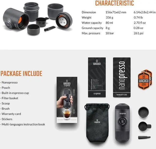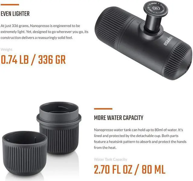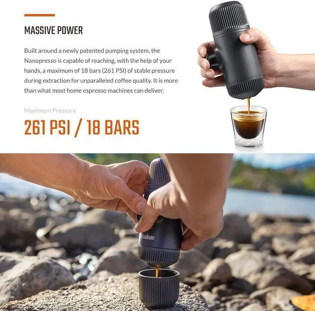 Packed with new features and capabilities, which will drastically improve the way you prepare your favorite coffee, Nanopresso is one of the best and most versatile espresso machines. A truly unique addition to your coffee toolkit! Built around a newly patented pumping system, the Nanopresso is capable of reaching, with the help of your hands, a maximum of 18 bars (261 PSI) of pressure for unparalleled coffee extractions qualities. The Nanopresso works best with finely ground coffee that is tamped hard. It is delightfully easy to operate and simple to use.