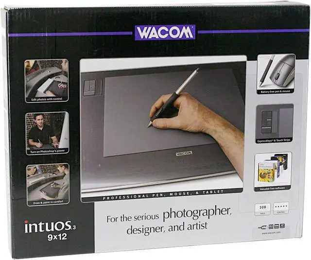 | Package Contents | Metallic gray Intuos3 9x12 Pen Tablet, Intuos3 Grip Pen, Five-button Mouse, and Pen Stand. Wacom tablet driver software, user manual, and bundled software |