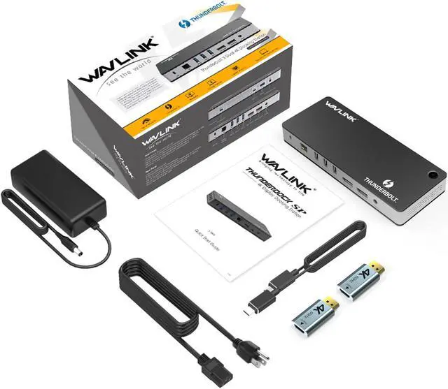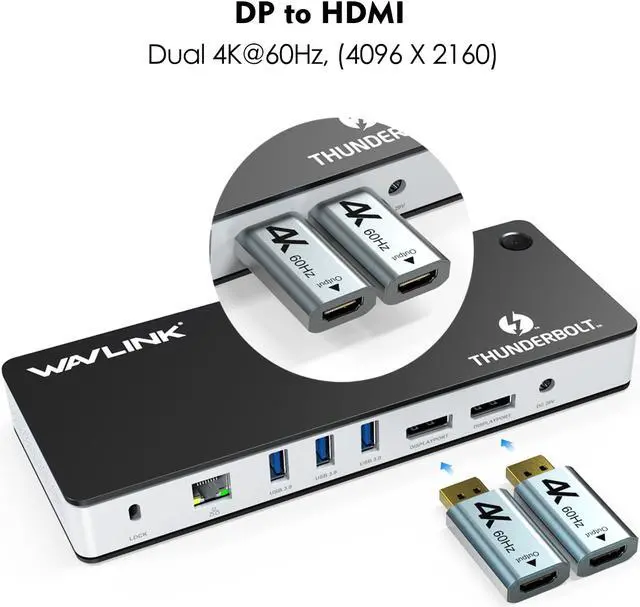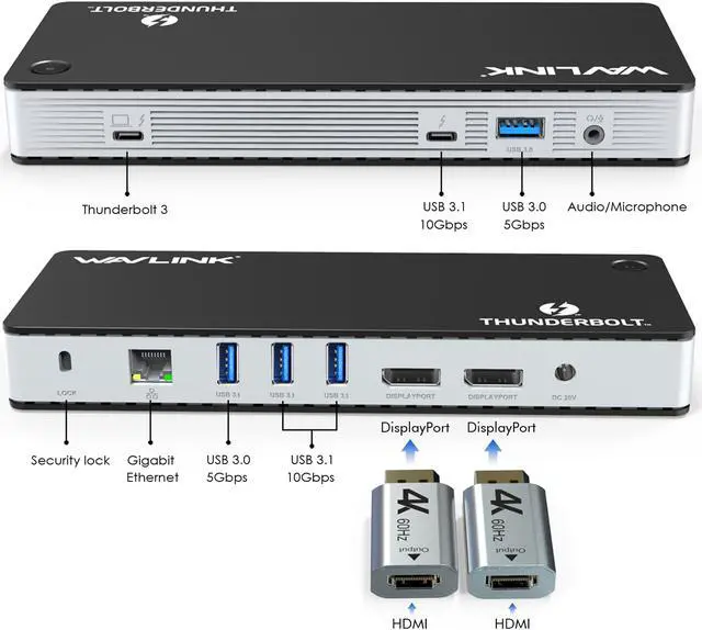 Wavlink Thunderbolt™ 3 Dual 4K Docking Station Thunderbolt 3 Titan USB-C Docking Station offers up to 60 watts of Power Delivery with the capability of connecting two 4K@60Hz displays. USB-C computer with USB 3.1 Gen. 2 port compatibility. Total six USB downstream ports to expand more USB devices connectivity including one USB-C and two USB-A ports running at max. 10Gbps, two USB-A ports running at max. 5Gbps. Dual displayport 1.4 enables additional two display, gigabit Intel Ethernet, audio input/output. Thunderbolt 3 host computer under HBR3, achieve a single port video maximum output resolution at 8K (7680 x 4320) @30Hz or 5K (5120 x3200) @30Hz for professional users.