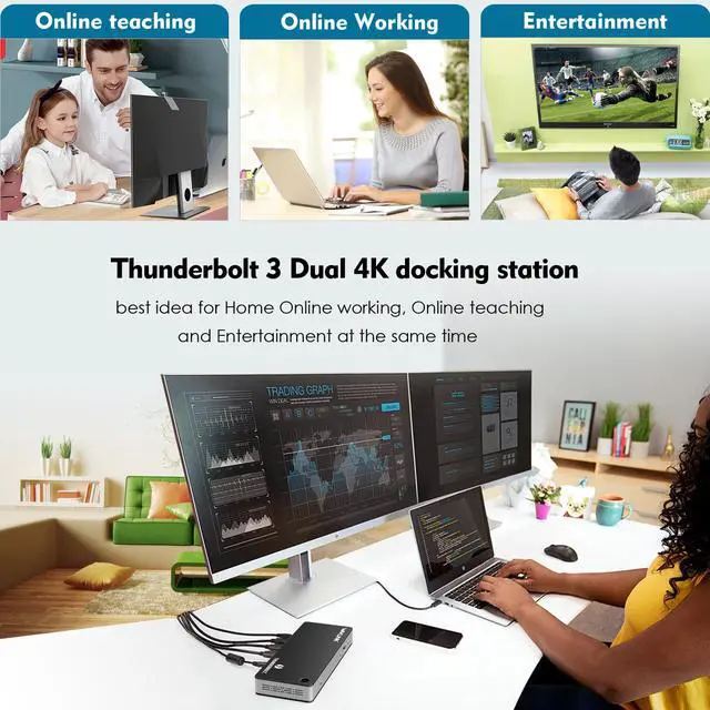 Port 1.4 docking station has been approved by Intel and we enjoy technology support from Intel. Customized for You Wavlink Thunderbolt™ 3 dock enables you to connect everything to your computer. You can use this dock to play full HD images/videos, connect USB-A and USB-C peripherals and charge the laptop at the same time. Dual 4K Display Full HD Images UTD21H supports dual 4K display by two Dispaly