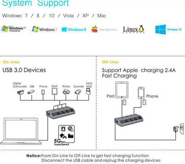 plug-and-paly, --Support quick charge (max. 2.4A ) provided by DC 5V / 4A power adapter. --Compatible with most Windows10, 8.1, 8, 7, Vista, XP, Mac OS X (10. x or higher), Linux PC and laptop with USB b>Apple-style Aluminum Fineness, Sandblasted Design With the sleek and durable apple-style aluminum fineness, the Hub effectively withstands scratches from repeatedly plugging in. Couple with a lightweight design, the Hub is an ideal companion for your Mac