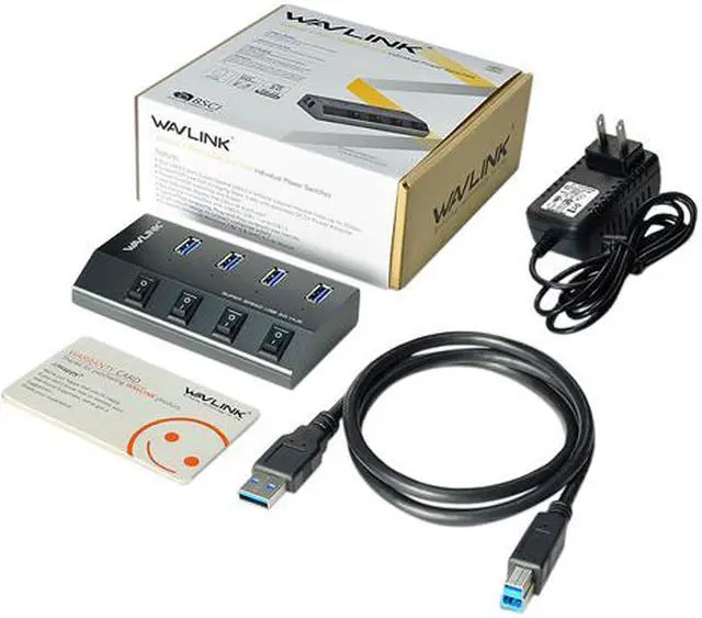 What is in the box: 1 x Wavlink USB 3.0 4 ports HUB, 1 x USB 3.0 Extension cable 0.8M, 1 x DC5V/4A Adapter Any question will be welcome, aftersales@Wavlink. com