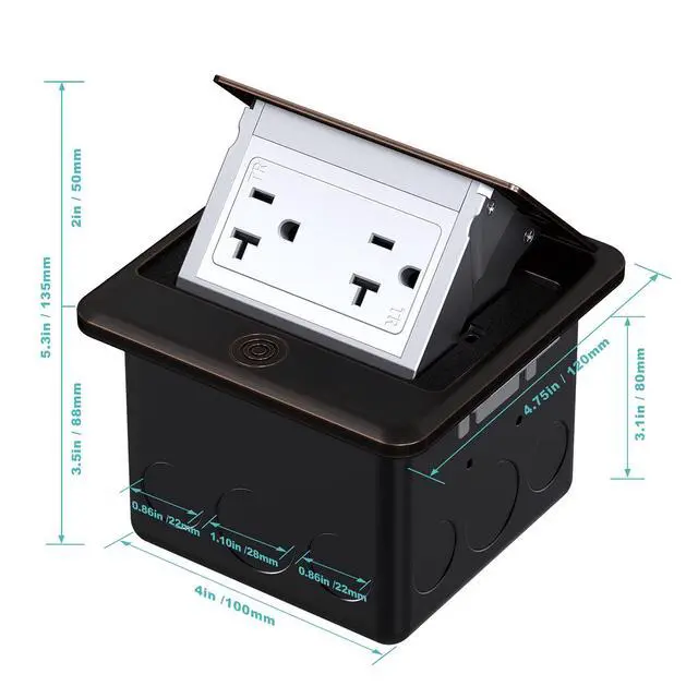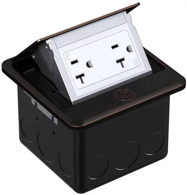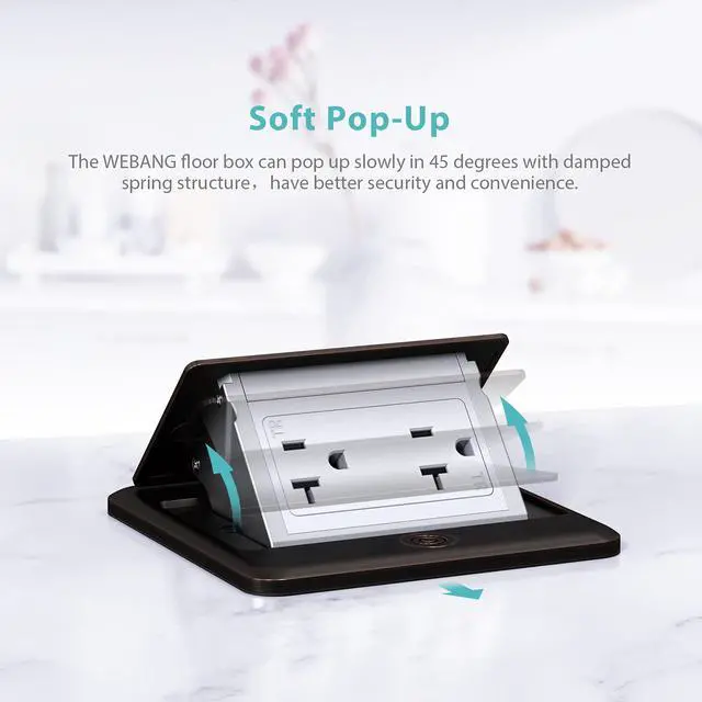 WEBANG Pop Up Outlet Box can be hidden in the countertop or floor when closed. All you can see is a stylish oil rubbed bronze top.As long as you push the round button on the floor outlet's cover gently, the top will tilted open slowly.