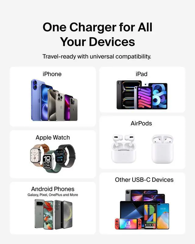| Compatible Phone Model | iPhone 17, iPhone Air, iPhone 17 Pro, iPhone 17 Pro Max, iPhone 16, 16e, 16 Pro, 16 Pro Max, 16 Plus, iPhone 15, 15 Pro, 15 Pro Max, 15 Plus, iPhone 14, 14 Plus, 14 Pro, 14 Pro Max, 13, 13 Mini, SE, 12, iPad Pro, Air, Mini, Galaxy S25, S25+, S24, S24+, Galaxy S23, S23+, S22, S22+, S21, S21+, Ultra, Note20, Fold, Z Fold, iPad Pro (12.9-inch) 4th generation, iPad Pro (11-inch) 2nd generation |