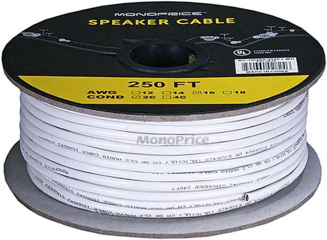 Monoprice Access Series 16 Gauge AWG CL2 Rated 2 Conductor Speaker Wire / Cable - 250ft Fire Safety In Wall Rated, Jacketed In White PVC Material 99.9% Oxygen-Free Pure Bare Copper