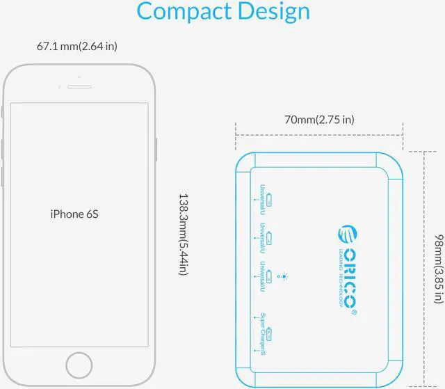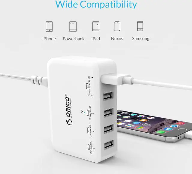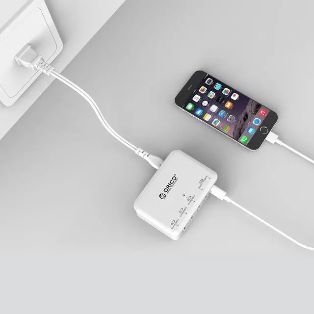ORICO 5 port USB charger is optimized to charge nearly any USB device. Compatible with but NOT limited to iPad Air, iPad mini, iPhone 5S/6/6 Plus, iPod touch, Nexus 6, HTC One, LG G3, Lumia, Motorola Droid Turbo, Moto G and etc
