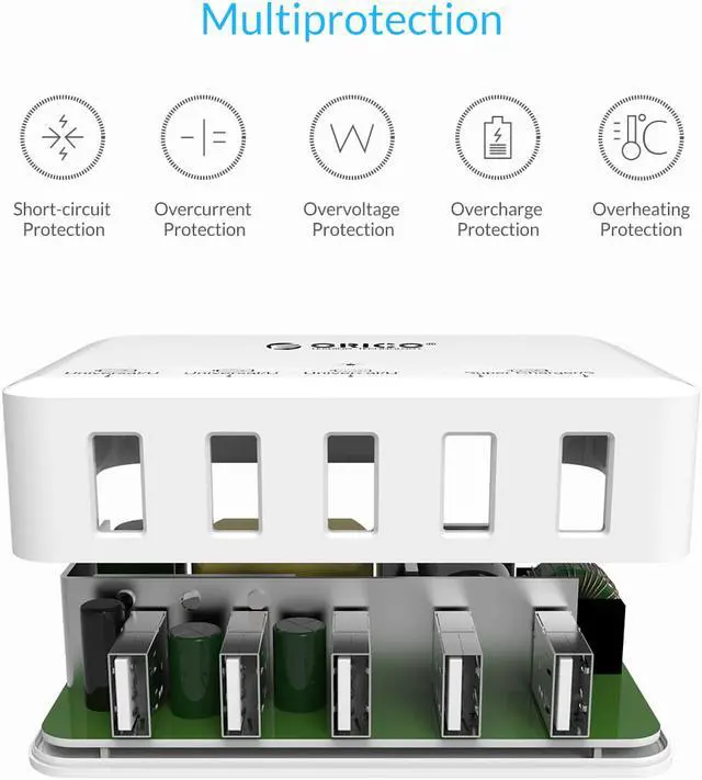 ORICO 5 Port USB Desktop Rapid Charger provides 5 USB ports and a total output of 40 watts, 4* 5V 2.4A Rapid charging ports, which offers the fastest possible charge speed up to 2.4 amps per port or 7.8 amps overall. Its family-sized 5 ports lets you full charge any combination of cellphones, tablets, MP3 or other USB-charged devices simultaneously.