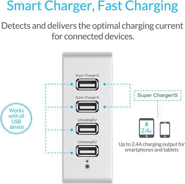 Port allows soild and great for charging tablets fast but works with smartphones as well, Such as iPhone 5S, 5C, 5, 4S, 4, Android devices, mobile Phone. it can charge at 1 amps/5 volts each port. < Compatibility
