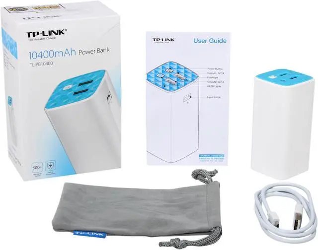 Package contents: TL-PB10400 Power Bank, Micro USB cable, travel pouch, Manual