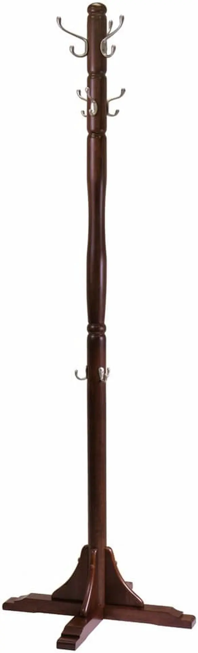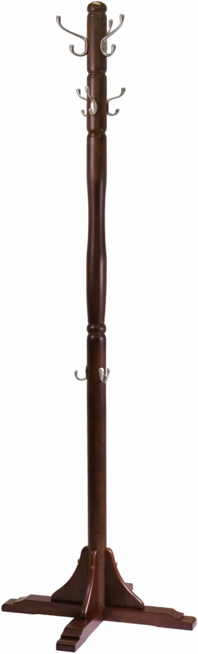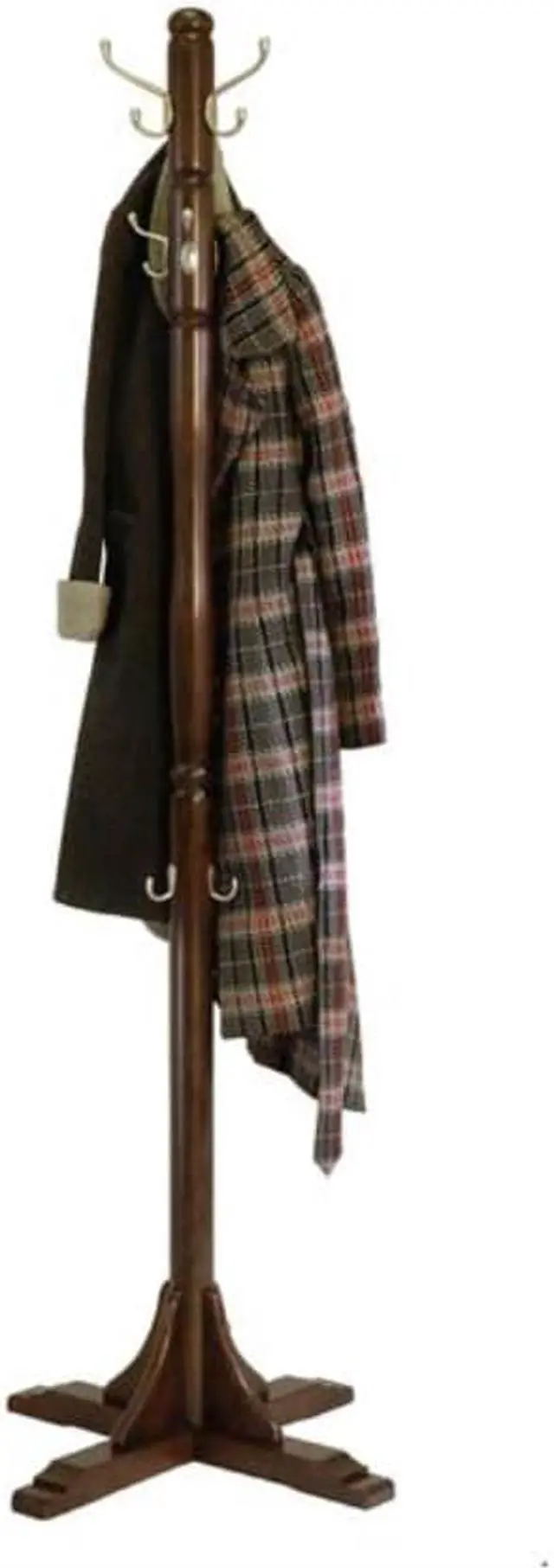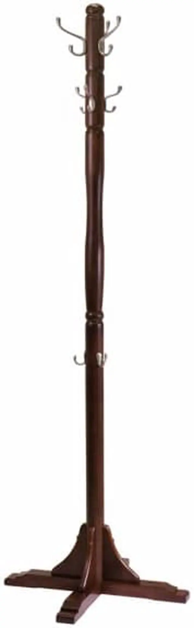 Offer your guests a warm place to hang their hat with this classic coat tree. Traditional design features include a turned trunk and round finial. Modern updates include the 9 hooks. Quality-constructed from solid wood with a beautiful Cappuccino finish