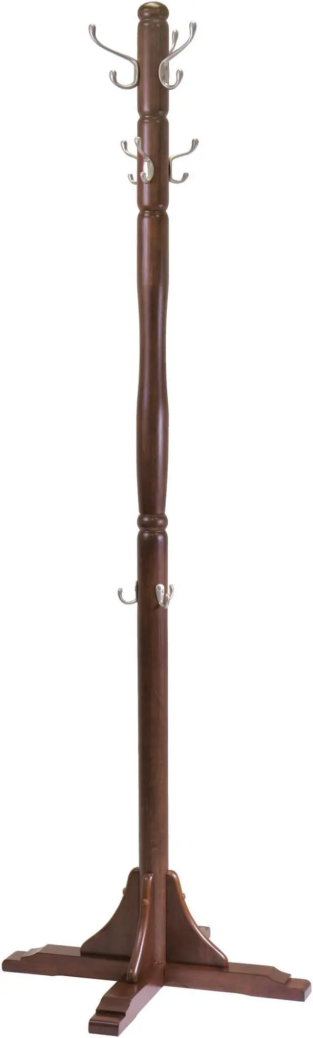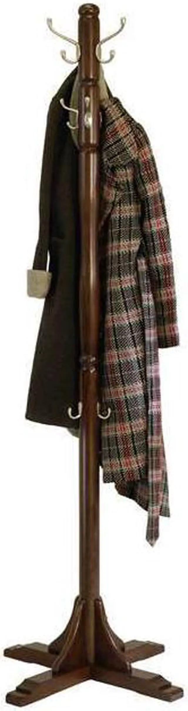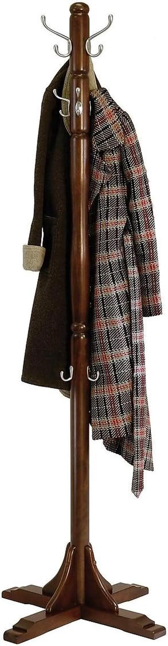 Offer your guests a warm place to hang their hat with this classic coat tree. Traditional design features include a turned trunk and round finial. Modern updates include the 9 hooks. Quality-constructed from solid wood with a beautiful Cappuccino finish