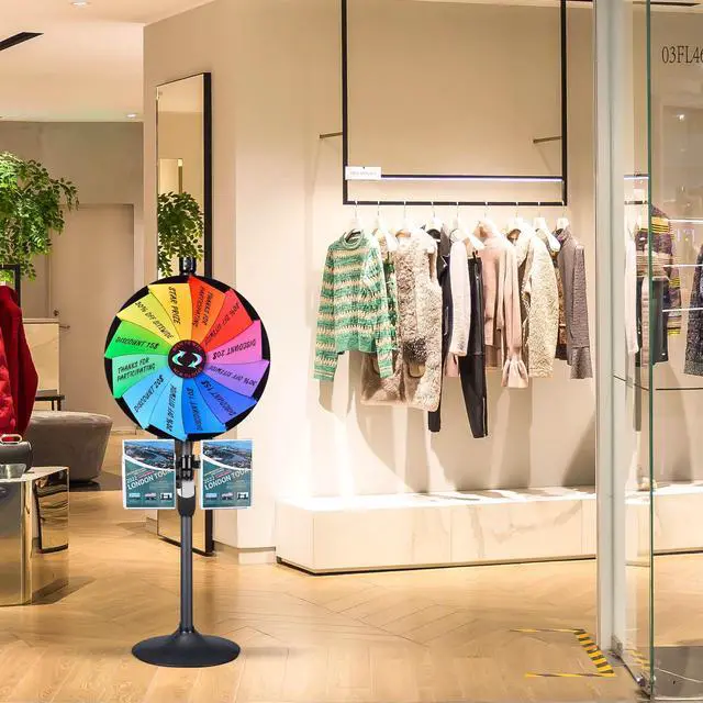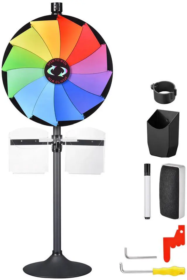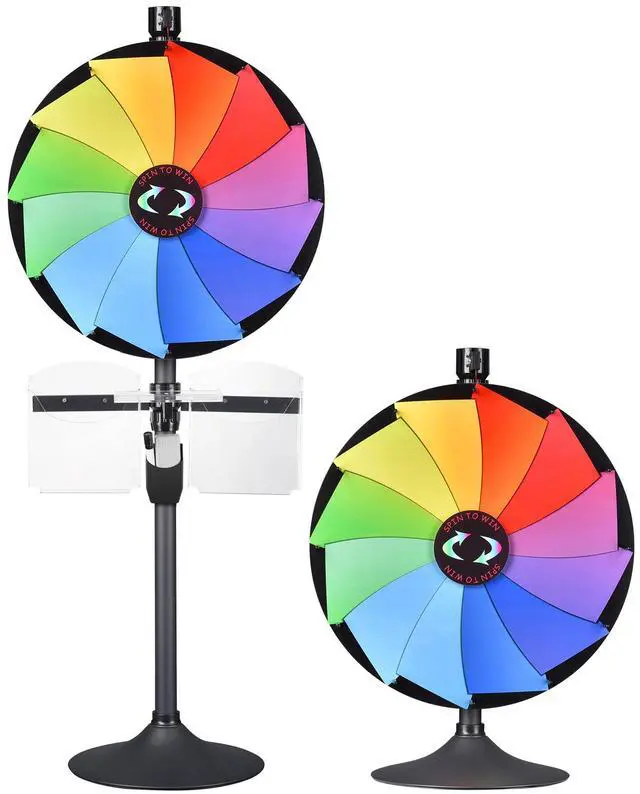 - Tabletop & Floor Stand Use - WinSpin 24" Color Prize Wheel features a round base & 2 sectional poles to provide 2 using ways, enabling to place on tabletop or stand on floor; Equipped with a windmill pattern template to create a stereoscopic effect for attraction, it's ideal for tradeshows, carnivals, parties, supermarkets, etc.