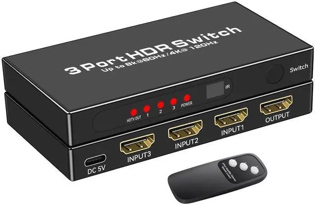 - [Switch Devices Easily]: Effortlessly switch between devices from the comfort of your couch or bed with the remote controller (The control range is within 33 FT). With 3 LED indicators that clearly show you which port is active. It will help you expand HDMI ports on your TV, no need to switch devices by plugging and unplugging the HDMI cables.NOTE: To achieve the high-resolution 8K@60Hz, please make sure that your HDMI cables, monitor and graphics card all support 8K@60Hz, and we recommend that you use a certified HDMI 2.1 cable that is less than 9.9ft AWG28.