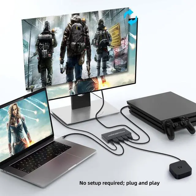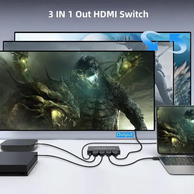 - [Universal Compatible]: This 8K HDMI Switch 3 in 1 out is suitable for most HDMI sources. Compatible Input: PS5/4/3, TV B-o-x, b-o-x, Switch, PC, Blu-ray DVD Player, etc.; Compatible Output: TV, Monitor, Projector, etc.Please note: Don't support ARC/eARC.