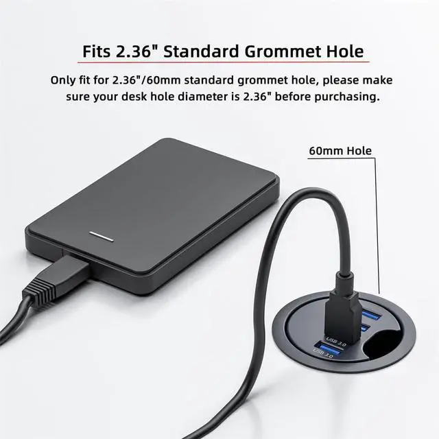 4) Fits 2.36" Standard Grommet Hole: Only fit for 2.36"/60mm standard grommet hole, please make sure your desk hole diameter is 2.36" before purchasing.
