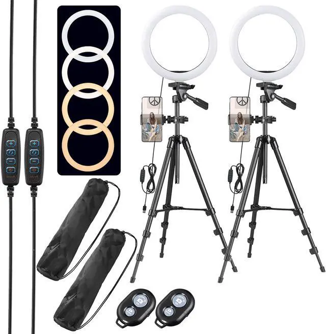 - Versatile Lighting Kit - 2 pack LED ring light kits include 10" LED ring lights, tripod stands & phone holders, make picture or video more vivid & attractive by providing sufficient light, ideal for YouTube video, Live streaming, doing makeup or portrait shooting