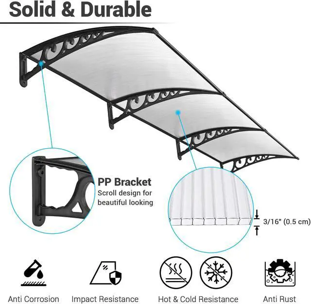 - Solid & Durable - 5 mm thick PC sheet with sturdy brackets & aluminum alloy stripes forms strong protection even under light snow and supports weight capacity up to 33 Lbs/sqm, and is resistant to corrosion, rust, impact, heat & cold; Anti-aging function lasts long time, ensuring 10 years lifespan of the sheet
