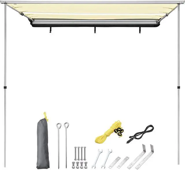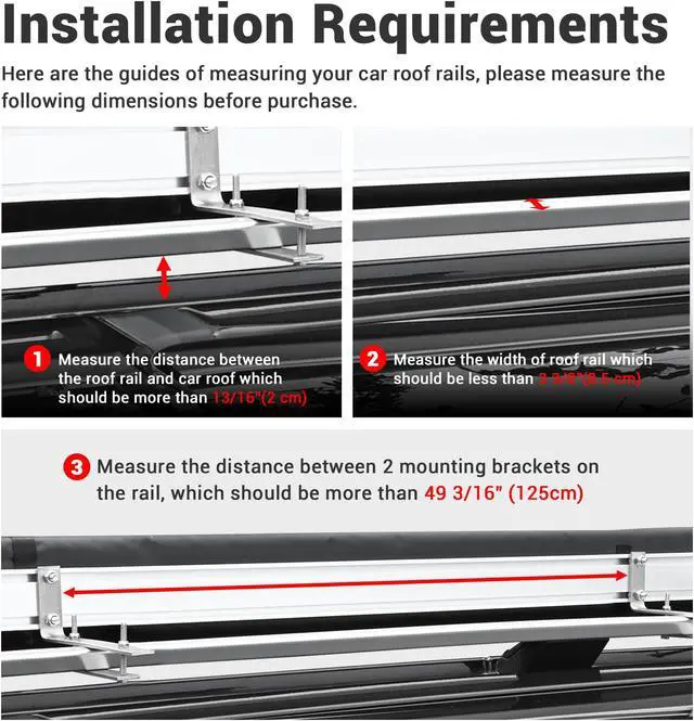 - Highly Compatible - 98 7/16" x 91 9/16" x 84 5/8" Car Side Awning with LED Light, providing 62 sq.ft large shading area, is designed to be installed on the most vehicles with rooftop rails, compatible with rail width less than 3 3/8", and the distance between rail and roof should more than 13/16" and the distance between 2 mounting brackets should more than 49 3/16"