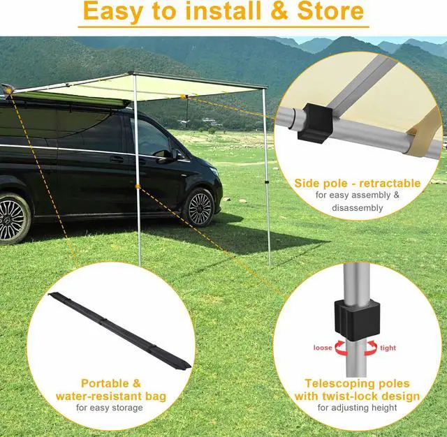 - Easy Installation & Storage - Features telescoping poles with twist-lock design, allowing for fast setup by simply mounting the brackets on the car roof, stretching out the awning, extending the poles and adjusting to your desired height; Its retractable design allows for easy disassembly and storage