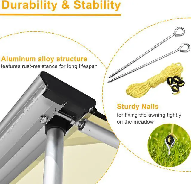 - Stable & Durable - Featuring a sturdy aluminum alloy structure with high-quality 304 stainless steel installation hardware to ensure outstanding rust-resistance and durability, along with pegs and guy ropes for extra stability and reinforced support for proper outdoor usage