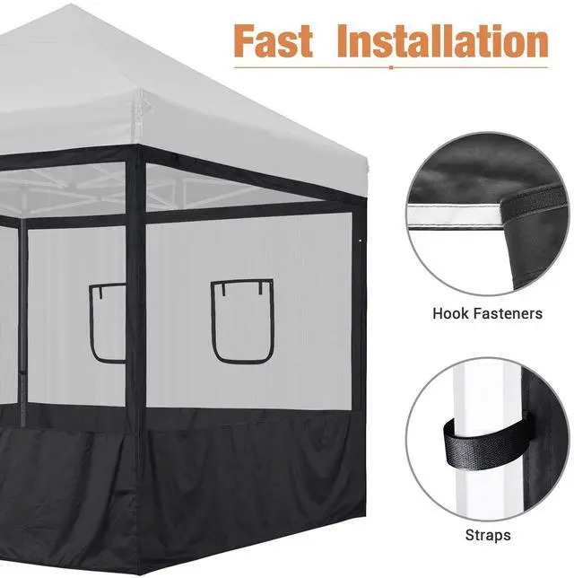 - Fast Installation - Equipped with hook fasteners on 3 sides to firmly attach the sidewall to your canopy, along with hook-and-loop straps on 3 sides to quickly fixate the sidewall to your canopy leg