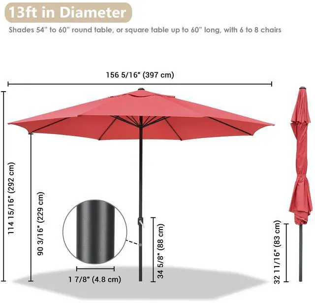 - Wide Application - 13 ft Patio Umbrella with 8 ribs can shade 54" to 60" round table or square table which is up to 60" long to offer sufficient sun shade for patio, garden, pool side, villa, hotel and café