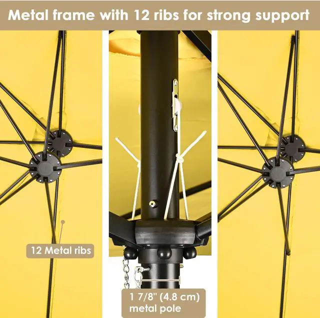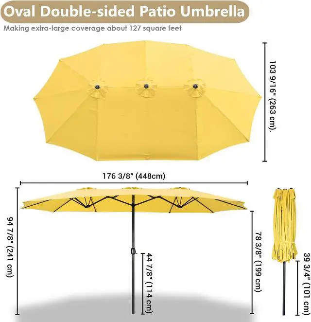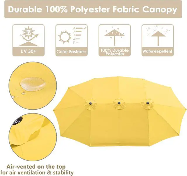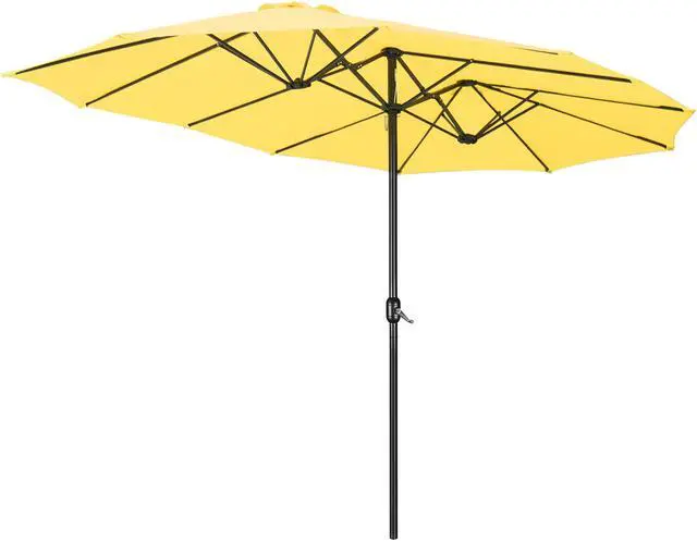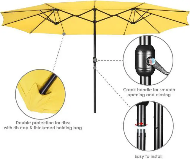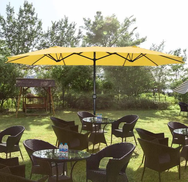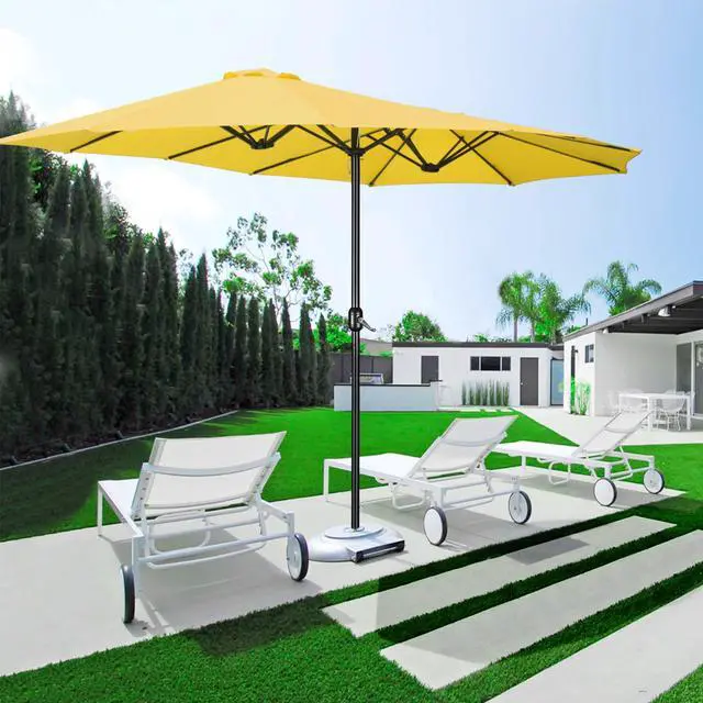- Extra-large Coverage - 15 ft Double-sided Patio Umbrella offers an extra-large shading area of about 133 square feet, perfect for use at the poolside and backyard to enjoy outdoor views with families and friends; Classic, jaunty style for blending in well with hotels, villas, and resorts
